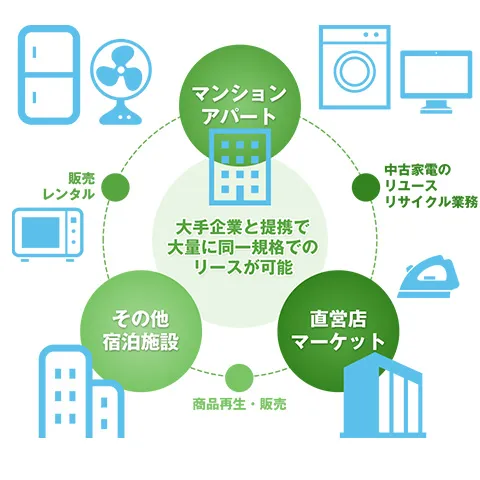リユース家電の取扱量に関して国内No.1の実績を誇る大手企業と提携。これにより、買取はより高く、・大規模の数のレンタルも可能です。